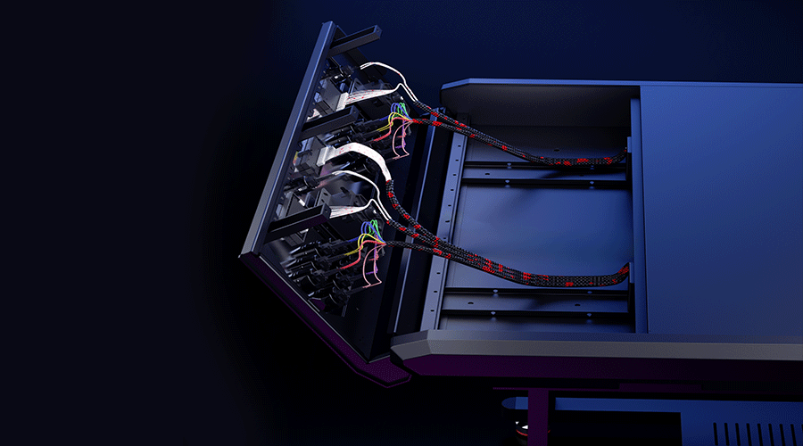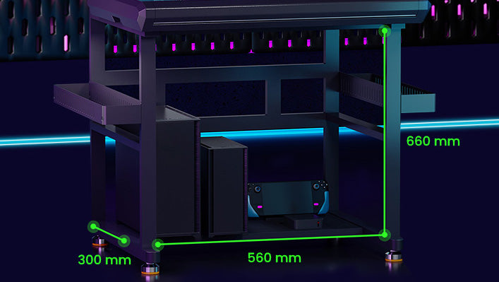 Its sturdy metal frame ensures optimum stability. The spacious bottom shelf and storage baskets on both sides provide practical storage space for your controllers, cables and other gaming essentials.