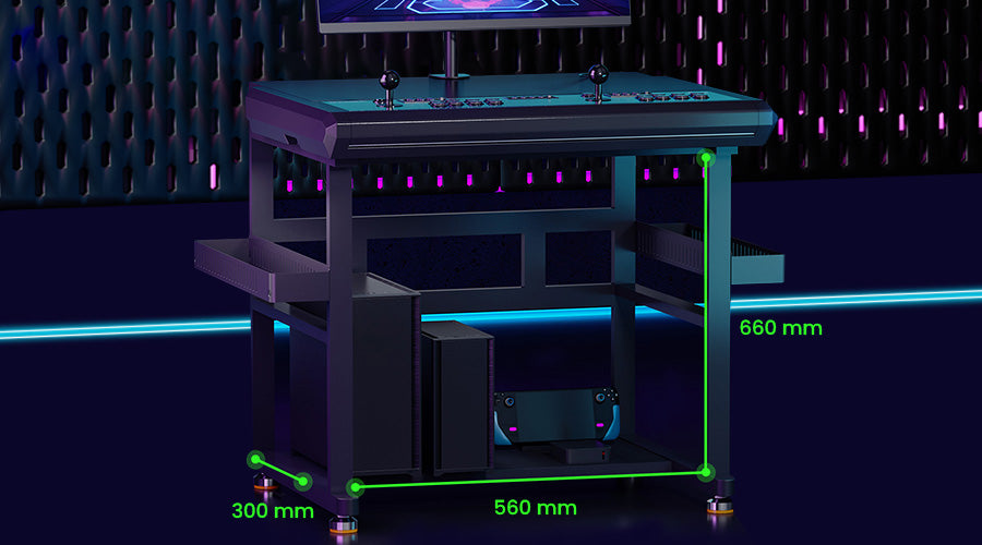 Su robusta estructura de metal garantiza una estabilidad óptima. El espacioso estante inferior junto con las cestas de almacenamiento en ambos lados brindan un almacenamiento conveniente para sus controladores, cables y otros elementos esenciales para juegos.